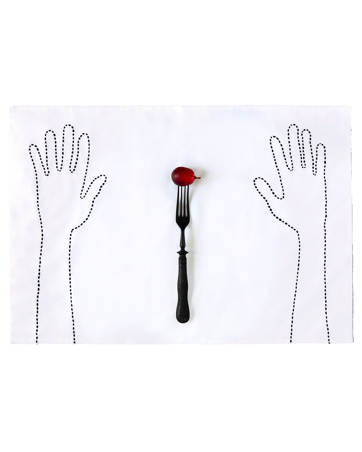 “I love to play… whether in life or in my work. Embroidered hands, seemingly wise. They appear to be waiting, but they are especially watching for the moment the table comes alive. They are placed on this table linen as if to remind us that a meal is also a story of gestures, exchanges, and smiles.” Valérie Barkowski