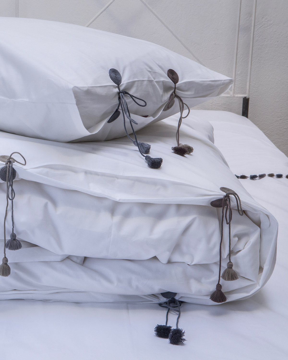 Pour cette parure de lit haut de gamme, la finition devient fermeture. Les cordons en fil tourné forment des spirales qui se terminent avec un pompon. Le linge de lit Yumi est en coton peigné et mercerisé et la production est réalisée, entièrement à la main, dans notre atelier à Marrakech.