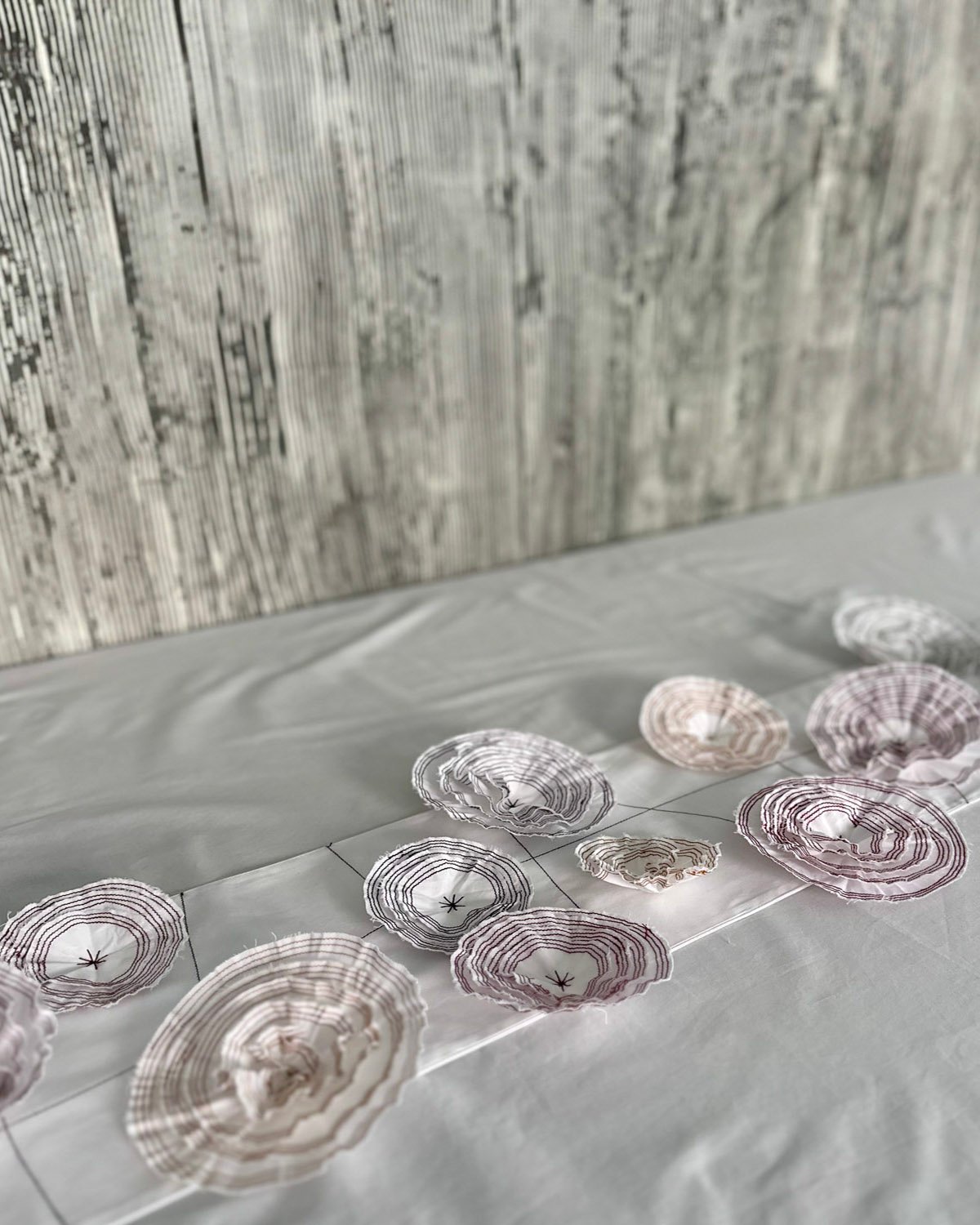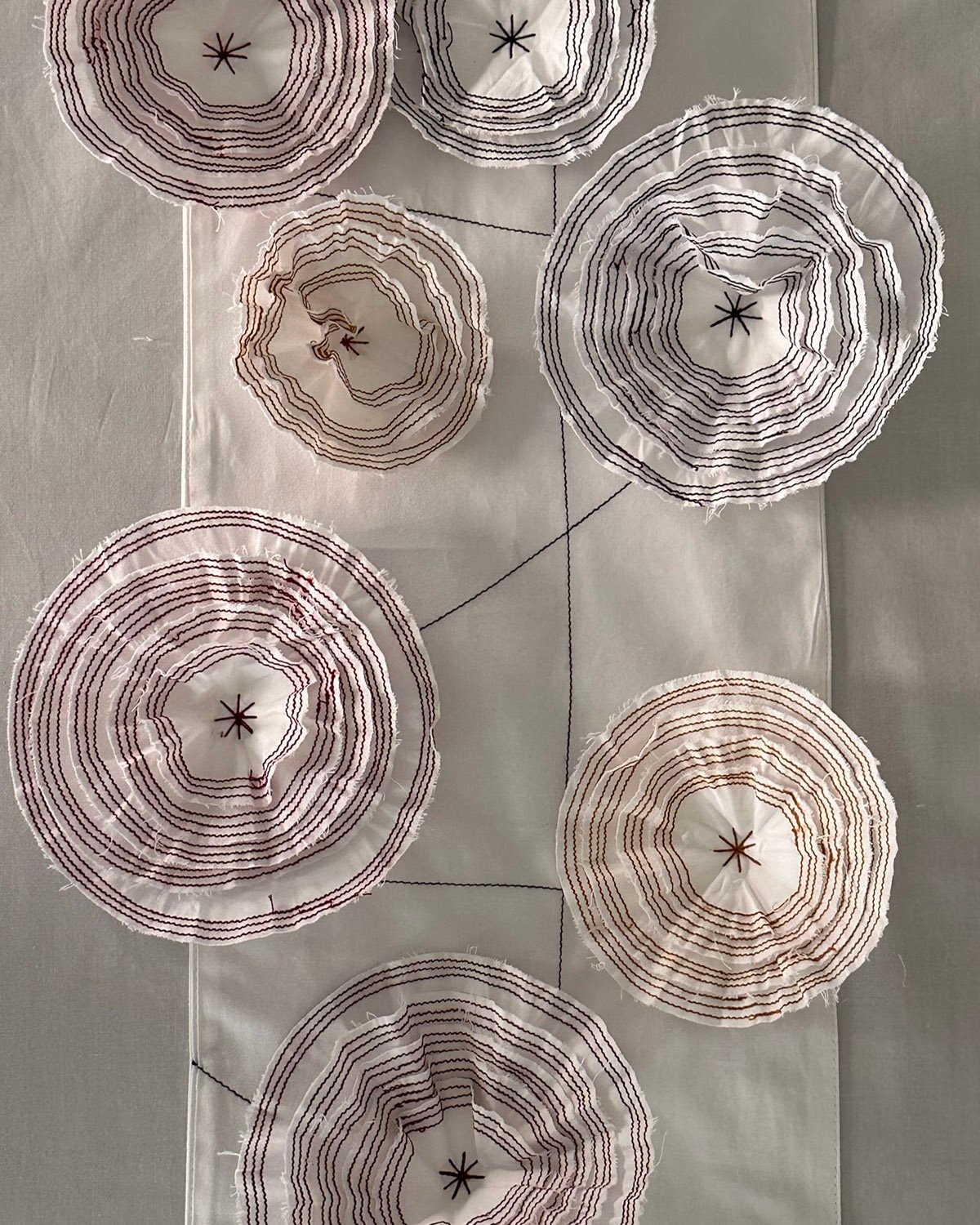 Les fleurs sont des disques en popeline de coton peigné qui sont superposés et cousus au centre avec un motif NOON. Les bords des fleurs sont eux aussi brodés avec plusieurs lignes qui se juxtaposent. Les fils de ces broderies ne sont pas coupés, c’est volontaire.