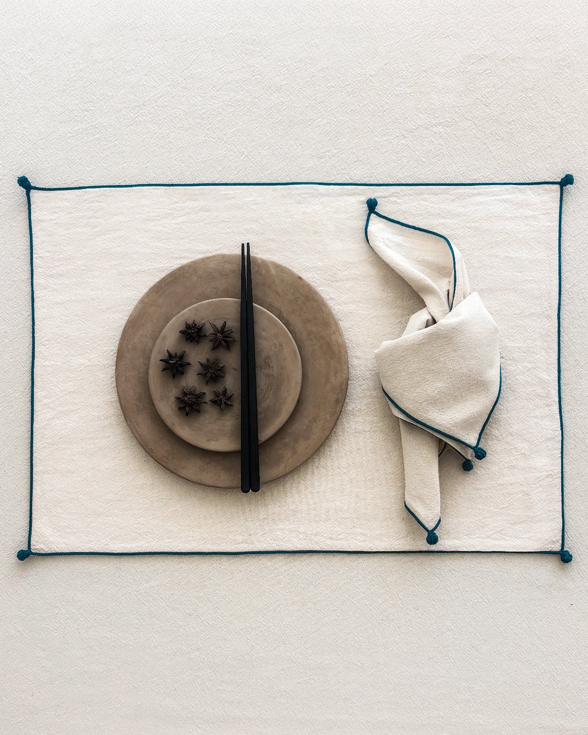Le set de table NIL, en coton écru, est brodé sur ses quatre côtés, avec un travail de passementerie aux quatre coins.